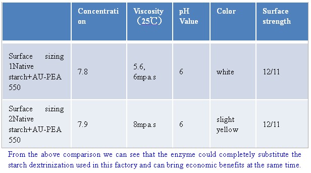 The function of AU-PEA550 is equal to starch modifying agent. With unique advantages, it is applicable to various kinds of paper pulp. The surface sizing agent for paper now is usually oxidized starch. The main disadvantages of traditional method of modifying oxidized-starch such as high cost, difficulties in controlling oxidation degree and environment pollution among others, can be easily conquered by enzyme starch modifying technics. |