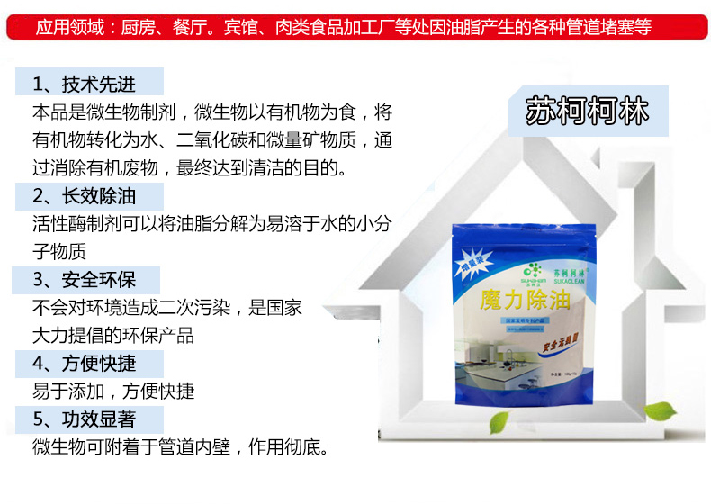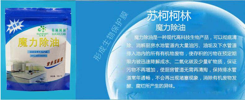 魔力除油是一种现代高科技生物产品,可以清除、消解厨房水池管道内大量油污、油垢及下水管道排入池内的所有有机物废物,使存积的污物在预定期限内被迅速降解成水、二氧化碳及少量矿物质,保证污物不再增加,使厨房管道无需再清掏,保持排水管道常年通畅,不会再出现堵塞现象,消除有机废物发酵、腐烂所产生的异味。