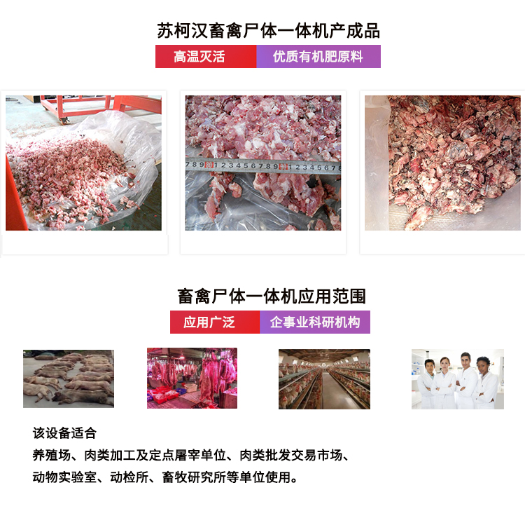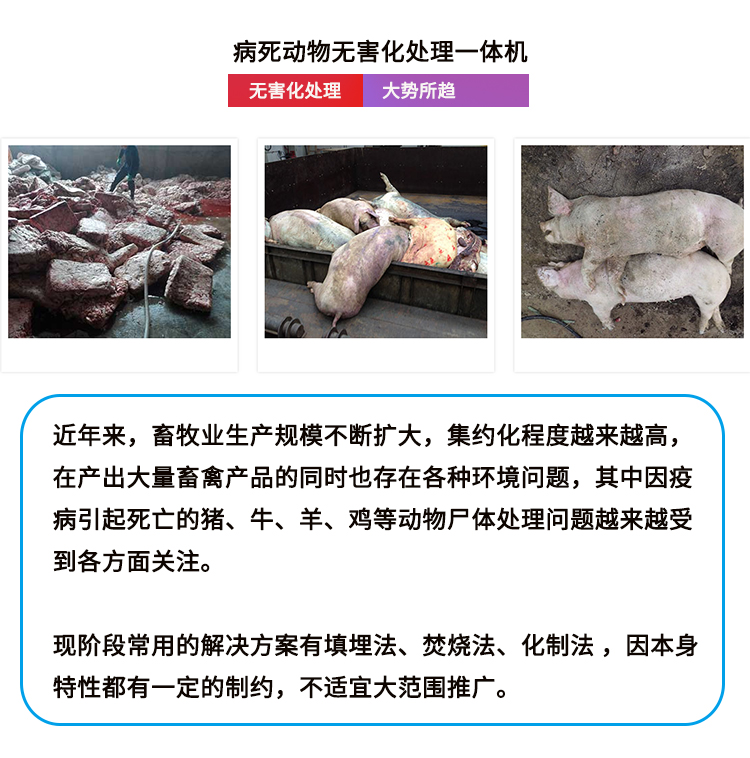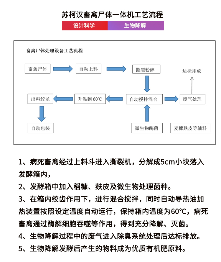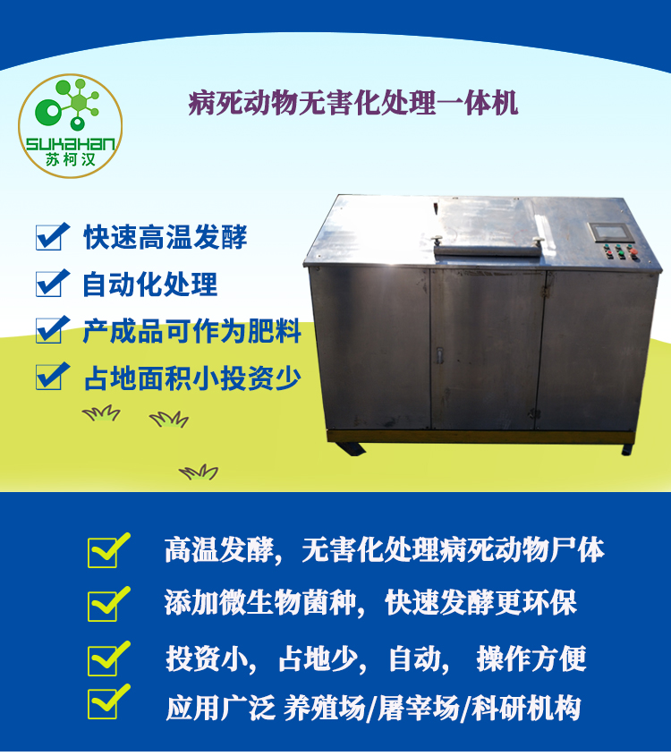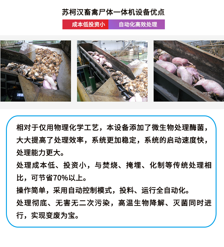 高温发酵,无害化处理病死动物尸体 添加微生物菌种,快速发酵更环保 投资小,占地少,自动, 操作方便 应用广泛 养殖场/屠宰场/科研机构