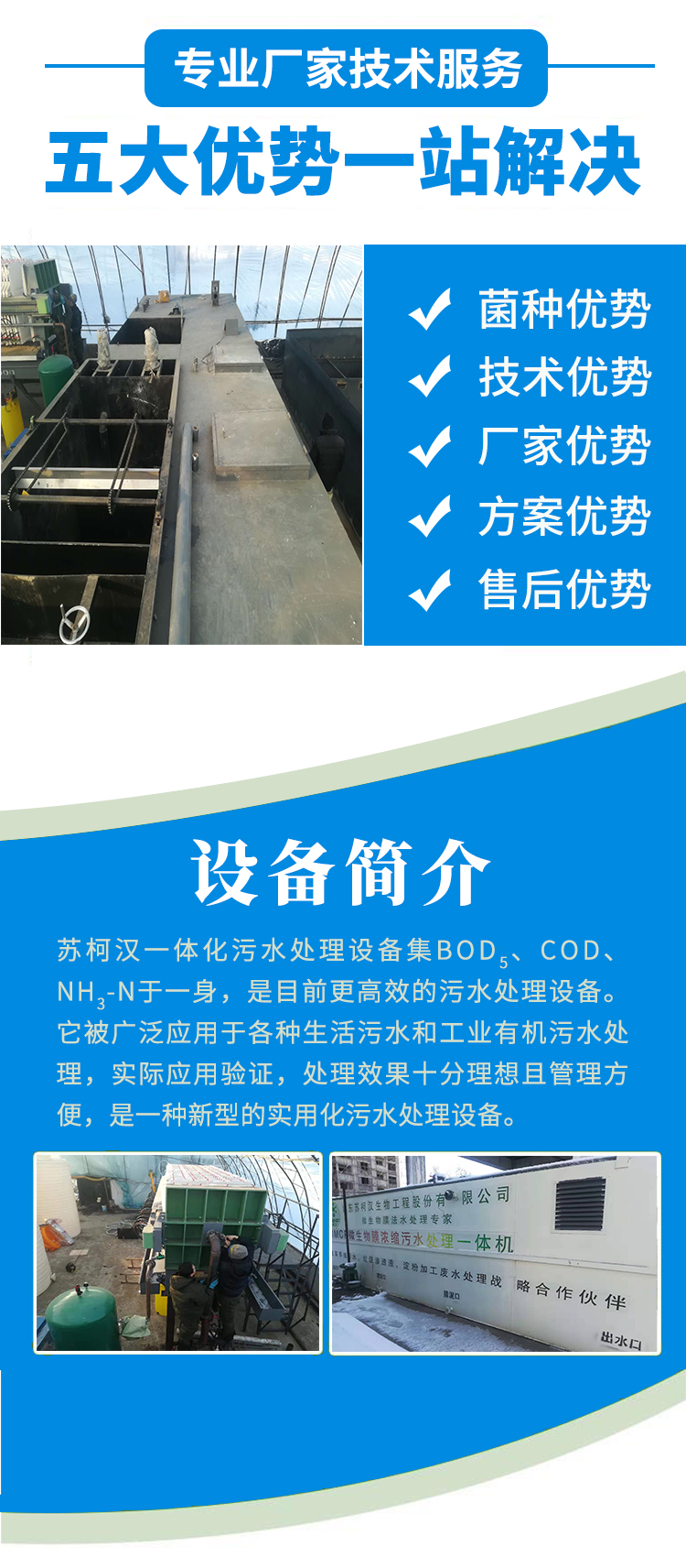 苏柯汉一体化污水处理设备集BOD5、COD、NH3-N于一身,是目前更高效的污水处理设备。它被广泛应用于各种生活污水和工业有机污水处理,实际应用验证,处理效果十分理想且管理方便,是一种新型的实用化污水处理设备。